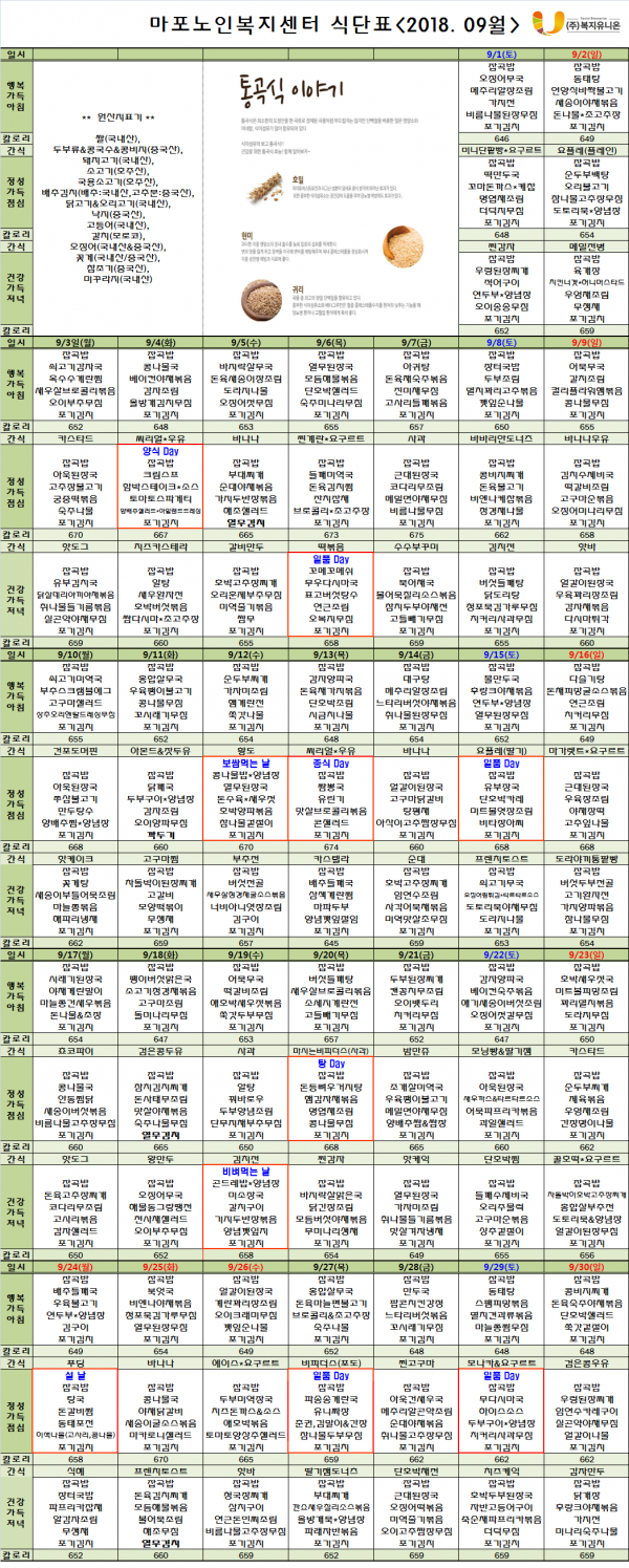 2018년 9월 식단표입니다. 페이지 정보 작성자 마포복지 작성일18-09-03 13:38 조회1,625회 댓글0건 관련링크 이전글 다음글 목록 본문 마포노인복지센터 9월 식단표 안내 댓글목록 등록된 댓글이 없습니다. 이전글 다음글 목록