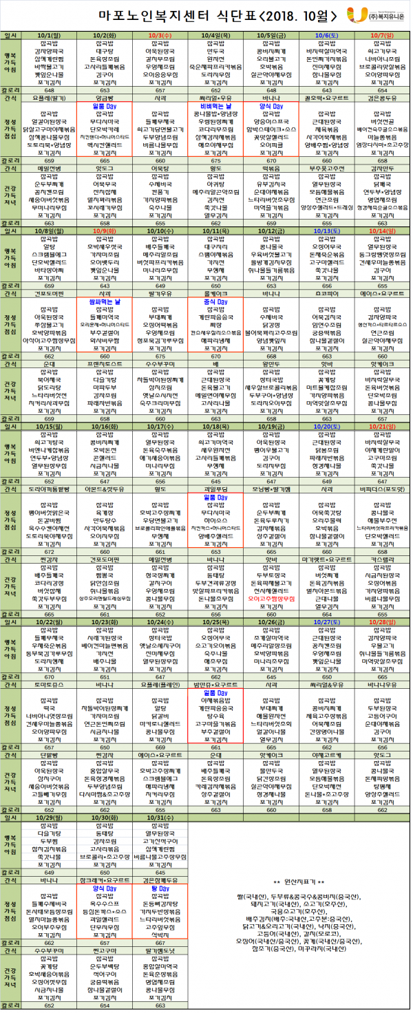 2018년 10월 식단표입니다. 페이지 정보 작성자 마포복지 작성일18-09-29 14:36 조회1,681회 댓글0건 관련링크 이전글 다음글 목록 본문 마포노인복지센터 10월 식단표 안내 댓글목록 등록된 댓글이 없습니다. 이전글 다음글 목록