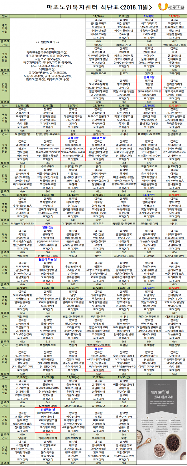 2018년 11월 식단표입니다. 페이지 정보 작성자 마포복지 작성일18-11-03 14:43 조회1,557회 댓글0건 관련링크 이전글 다음글 목록 본문 마포노인복지센터 11월 식단표 안내 댓글목록 등록된 댓글이 없습니다. 이전글 다음글 목록