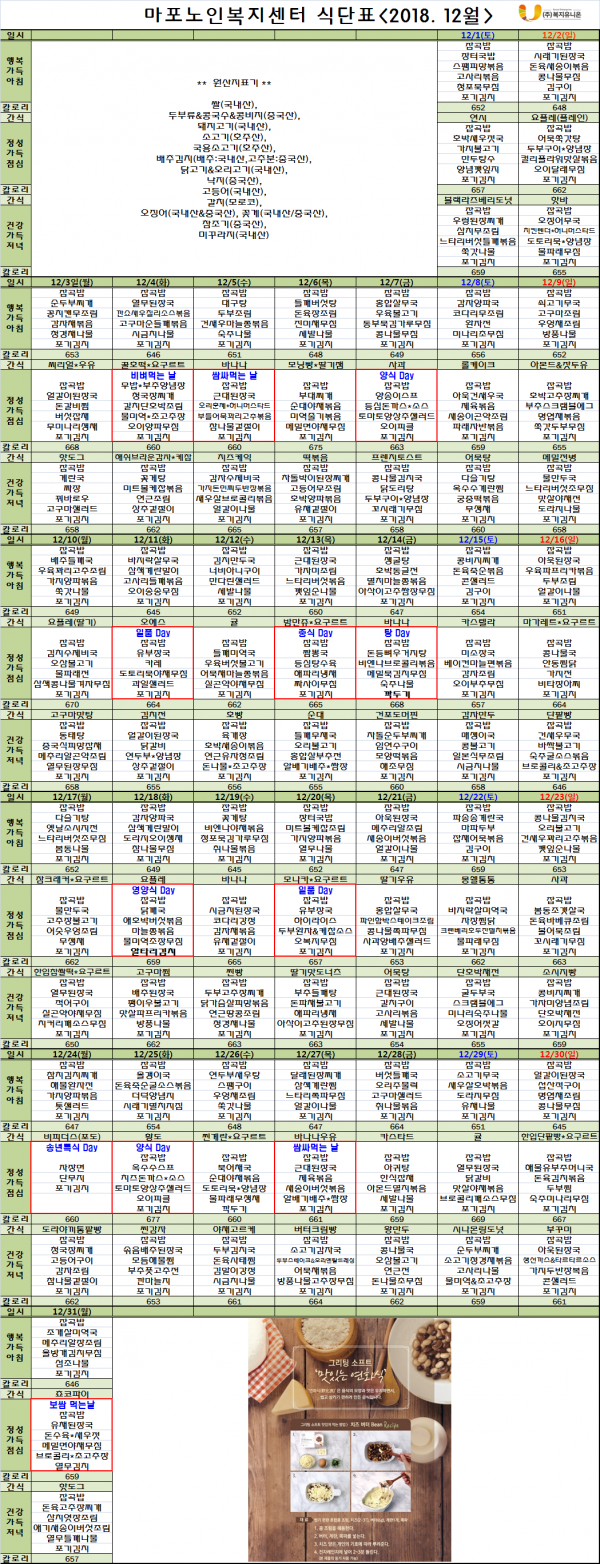 2018년 12월 식단표입니다. 페이지 정보 작성자 마포복지 작성일18-11-30 11:55 조회1,544회 댓글0건 관련링크 이전글 다음글 목록 본문 마포노인복지센터 12월 식단표 안내 댓글목록 등록된 댓글이 없습니다. 이전글 다음글 목록