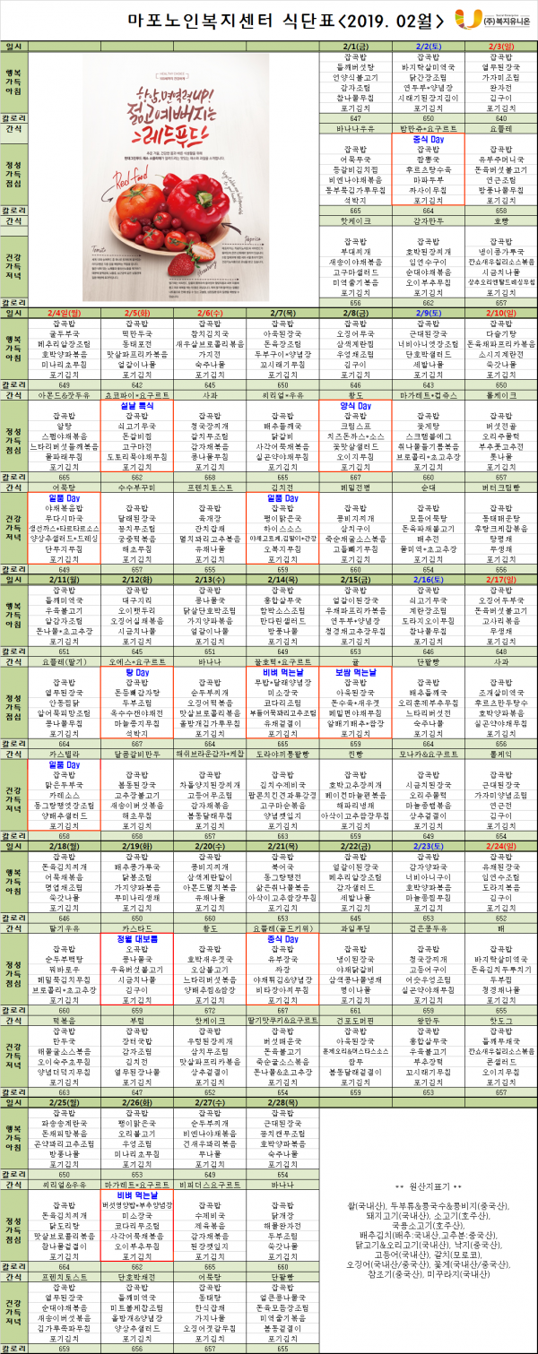 2019년 2월 식단표입니다. 페이지 정보 작성자 마포복지 작성일19-01-31 13:53 조회1,510회 댓글0건 관련링크 이전글 다음글 목록 본문 마포노인복지센터 2월 식단표 댓글목록 등록된 댓글이 없습니다. 이전글 다음글 목록