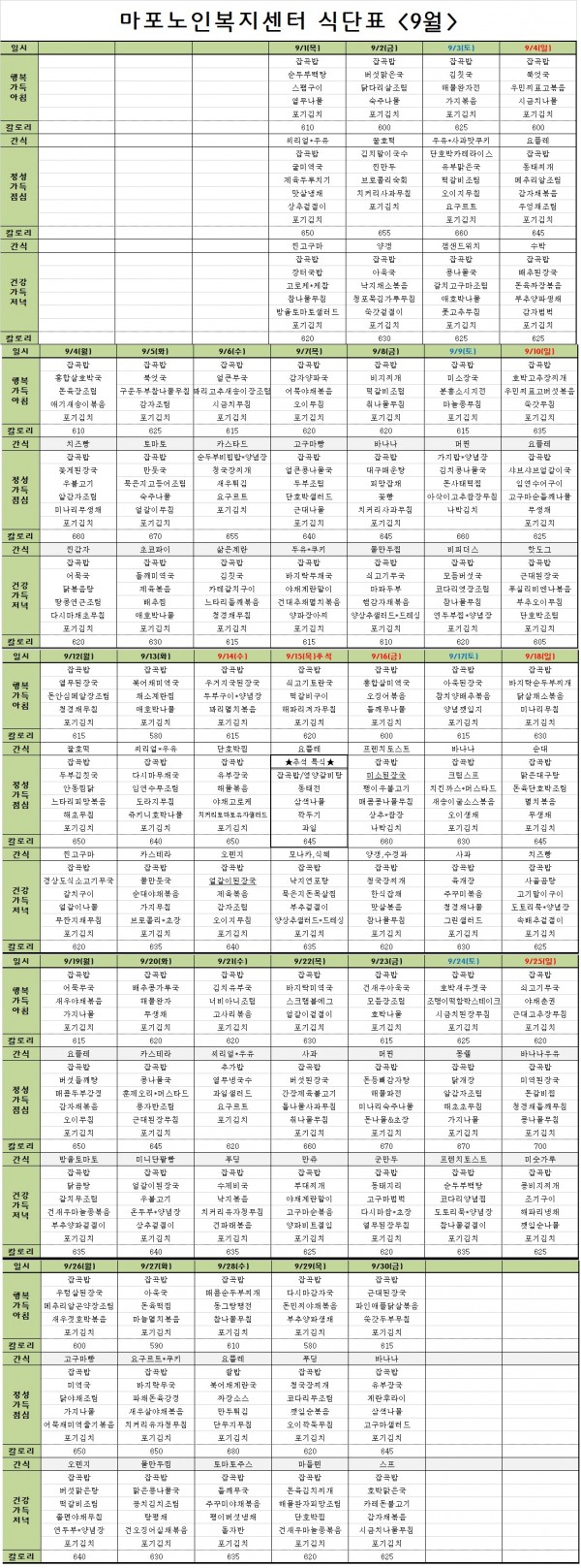 2016년 9월-(1) 식단표 입니다. 페이지 정보 작성자 마포복지 작성일16-09-13 11:29 조회1,543회 댓글0건 관련링크 이전글 다음글 목록 본문 추석 연휴 식자재 수급이 어려워 일부 메뉴가 변경되었습니다. 댓글목록 등록된 댓글이 없습니다. 이전글 다음글 목록