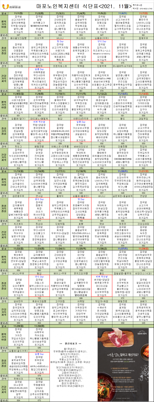 2021년 11월 식단표 안내 페이지 정보 작성자 마포노인 작성일21-10-29 16:57 조회1,141회 댓글0건 관련링크 이전글 다음글 목록 본문 2021년 11월 식단표 안내 댓글목록 등록된 댓글이 없습니다. 이전글 다음글 목록