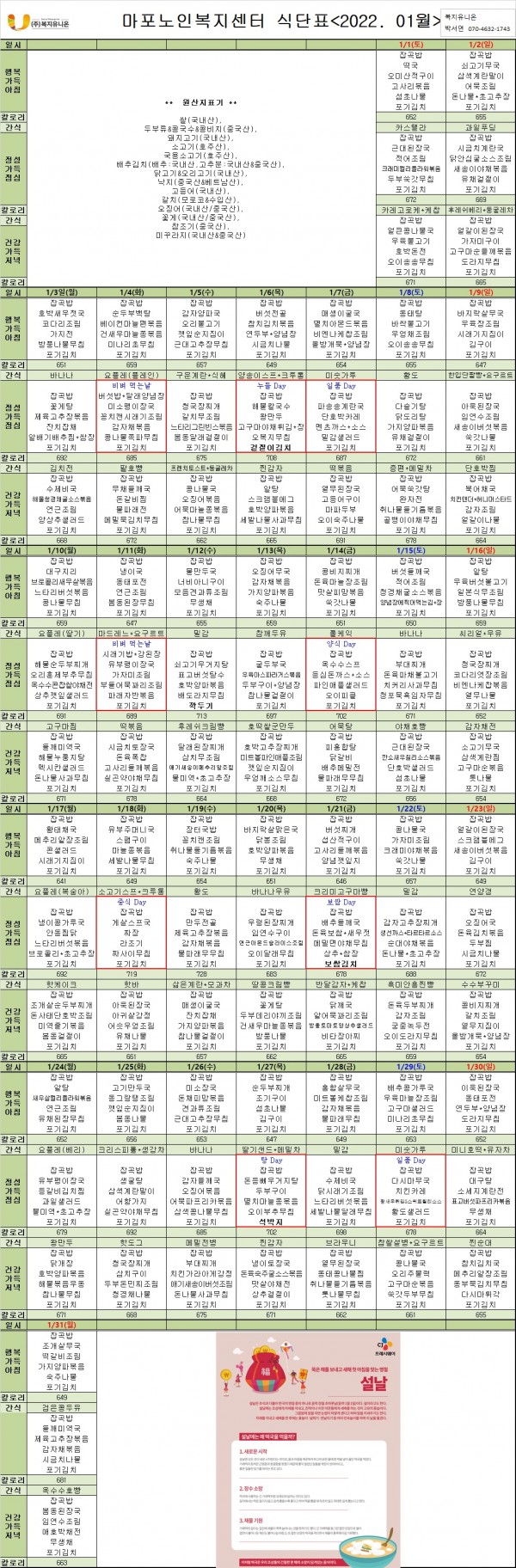 2022년 1월 식단표 안내 페이지 정보 작성자 마포노인 작성일21-12-27 14:19 조회987회 댓글0건 관련링크 이전글 다음글 목록 본문 2022년 1월 식단표 안내 댓글목록 등록된 댓글이 없습니다. 이전글 다음글 목록