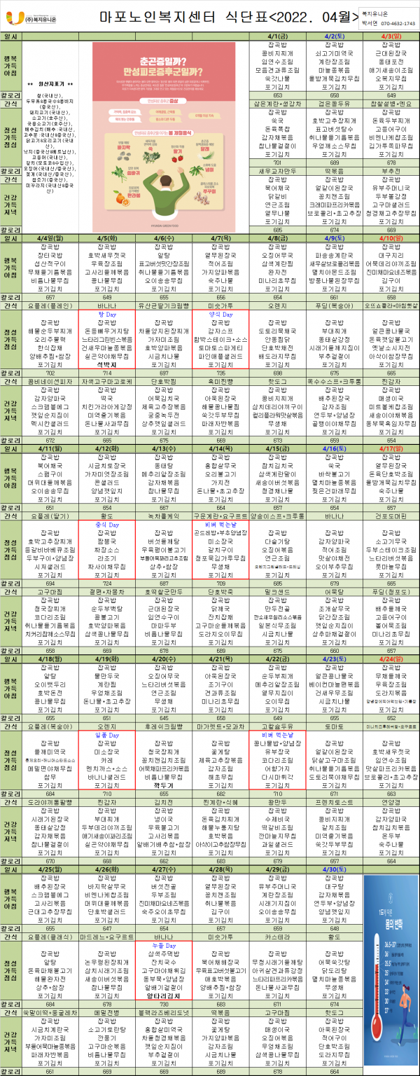 2022년 4월 식단표 안내 페이지 정보 작성자 마포노인 작성일22-03-31 15:12 조회911회 댓글0건 관련링크 이전글 다음글 목록 본문 2022년 4월 식단표 안내 댓글목록 등록된 댓글이 없습니다. 이전글 다음글 목록