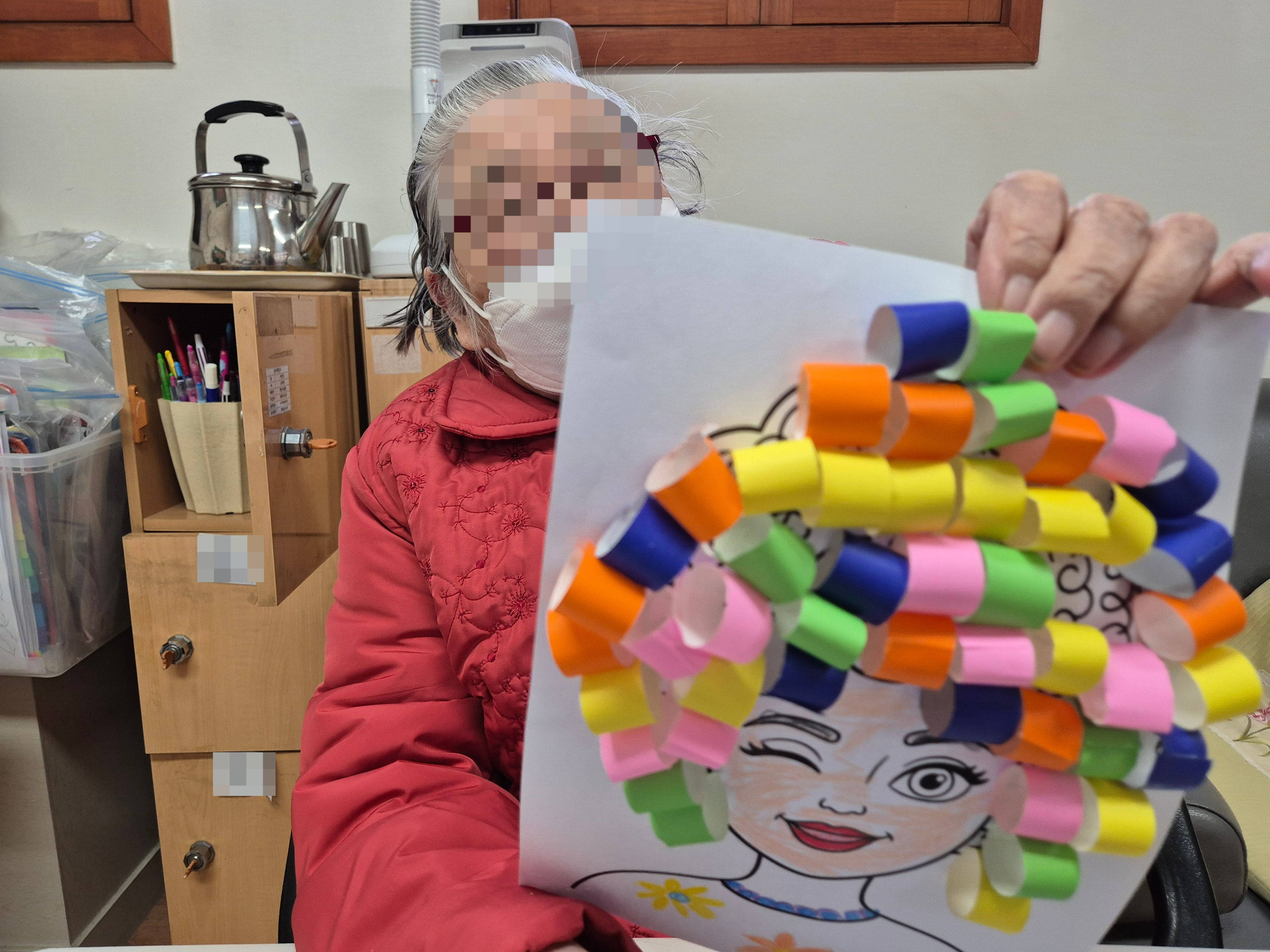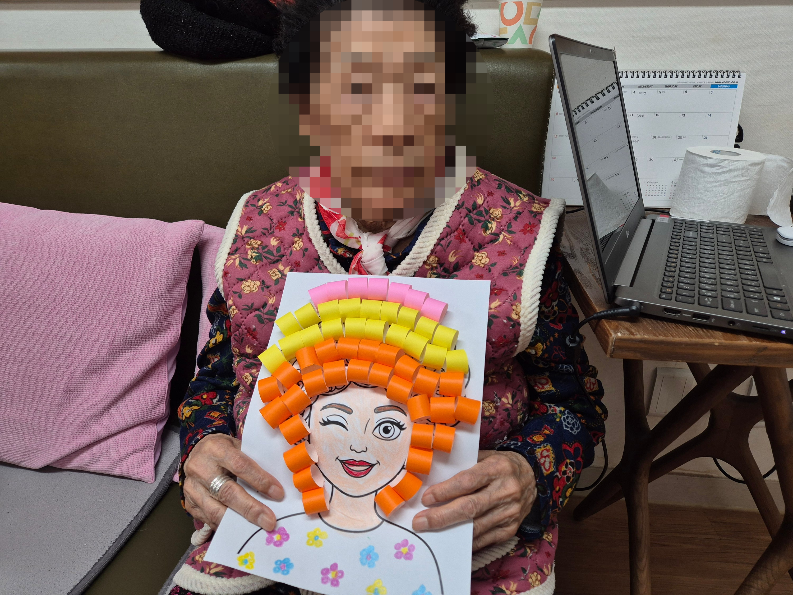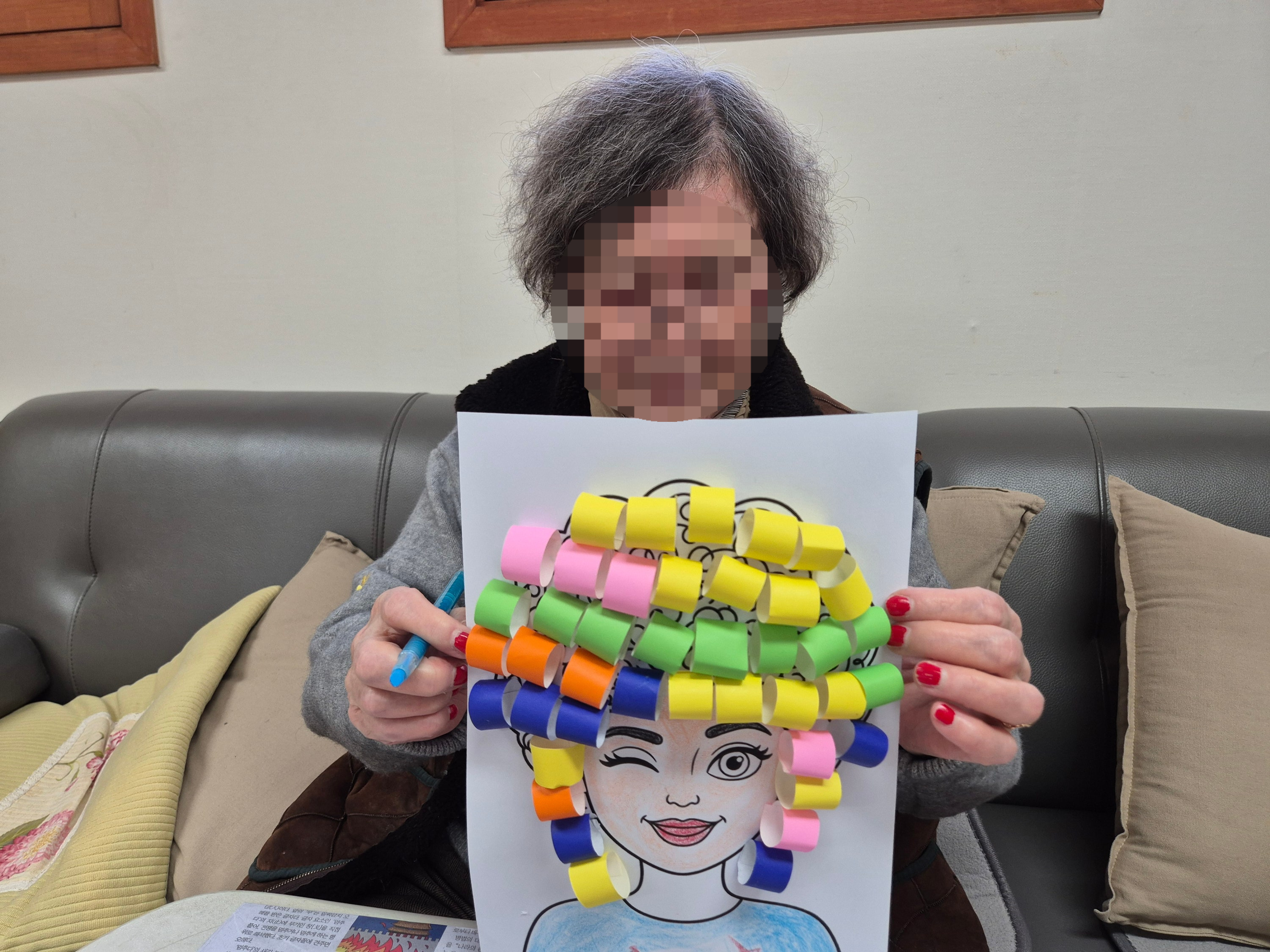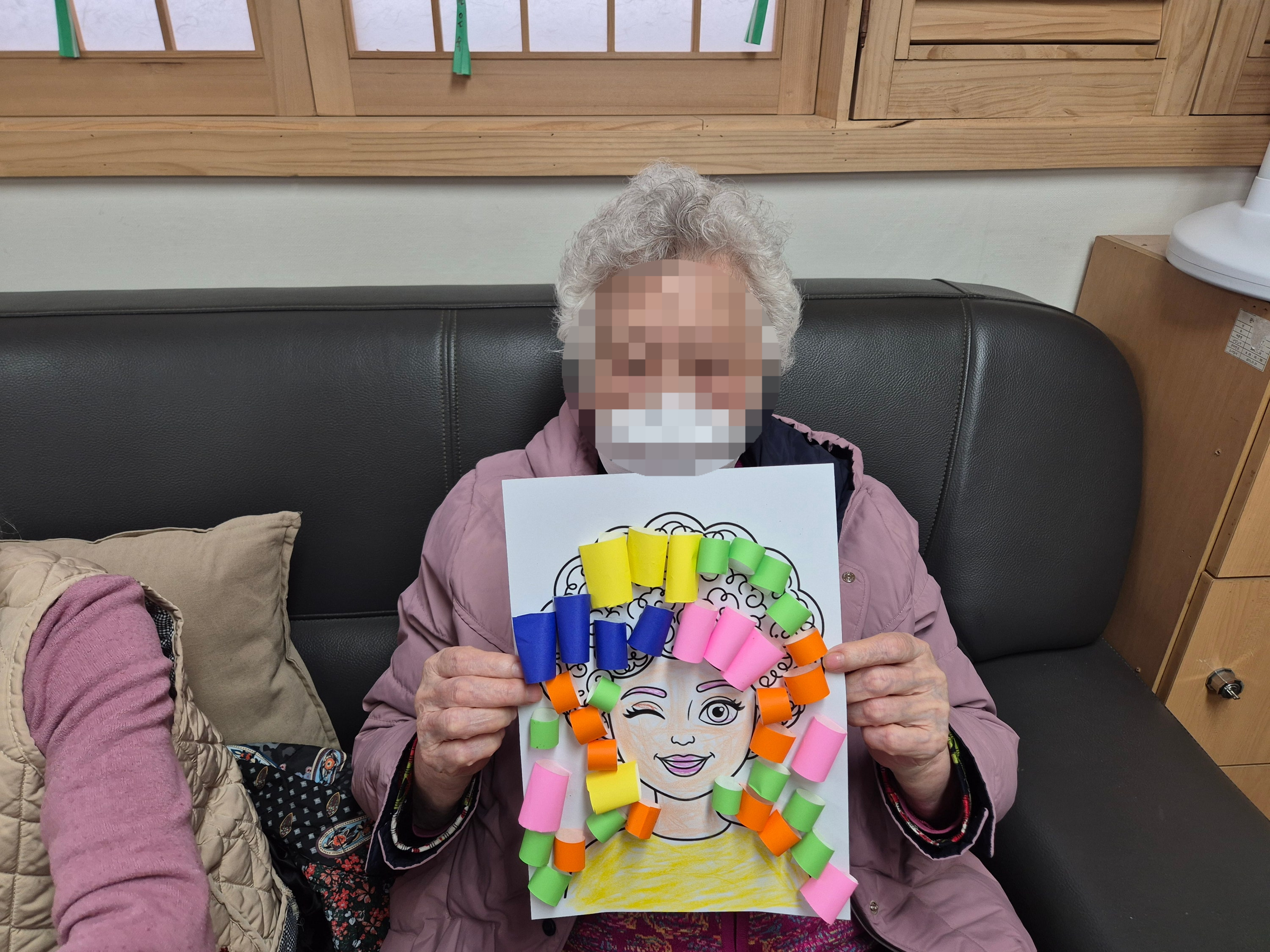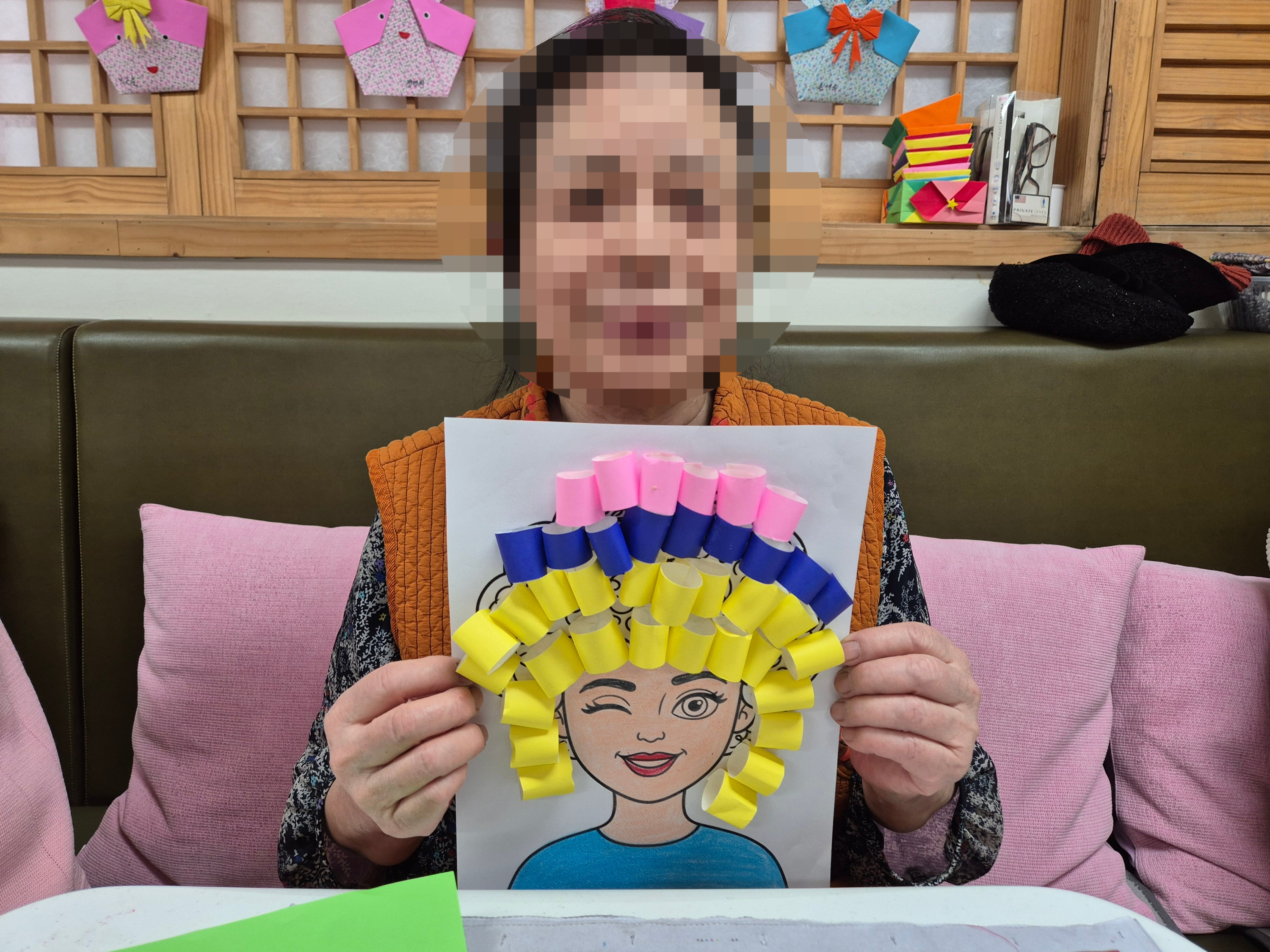 내용: 색종이를 둥글게 말아 촘촘히 부착하여 입체적인 파마 형태를 표현하였습니다.