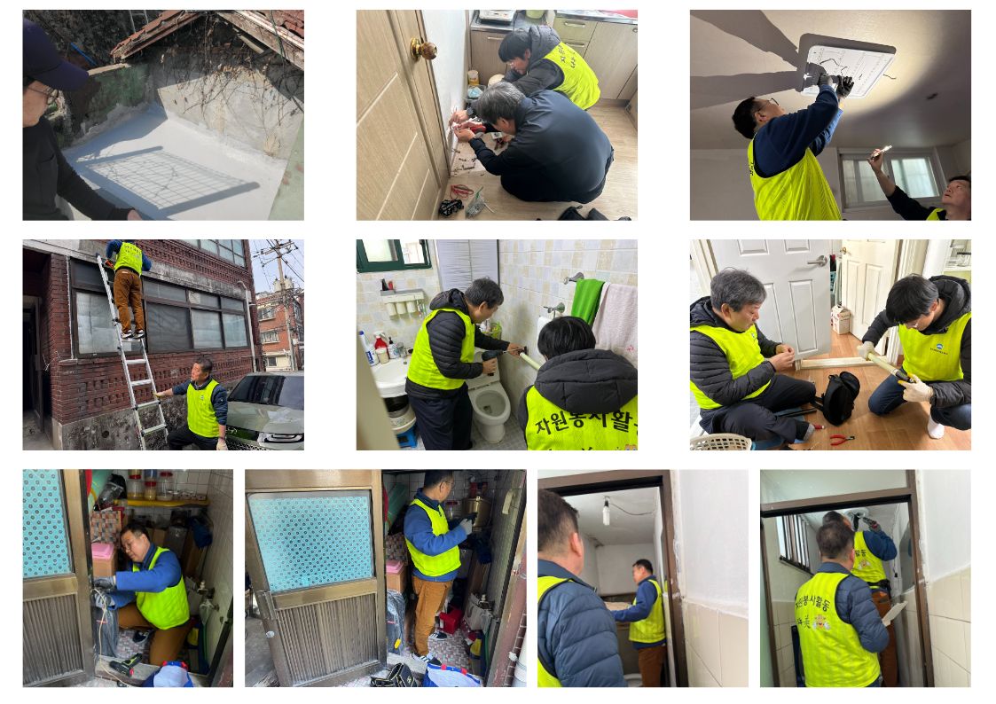 이번 봉사에서는 어르신 가정에 방문하여 화장실 및 베란다 방수, 거실 및 화장실 LED등 교체, 안전손잡이 수리, 전기선 정리, 콘센트 수리 등 주거환경개선을 진행하였습니다.
