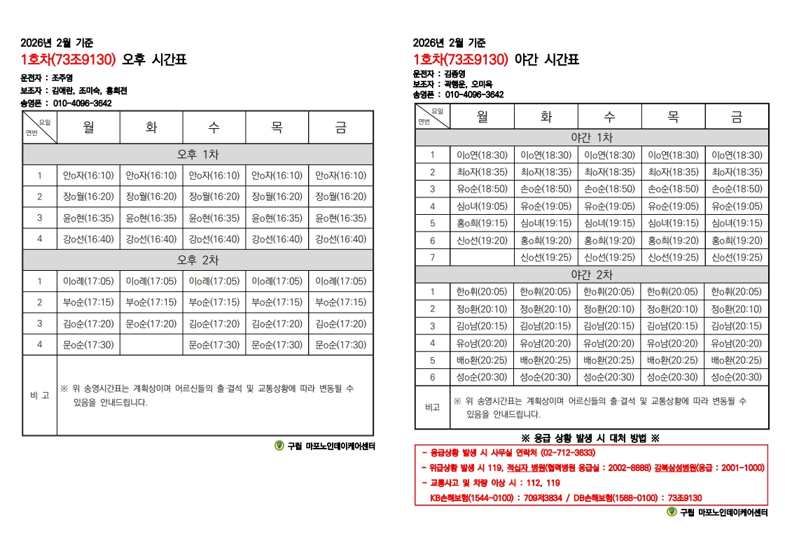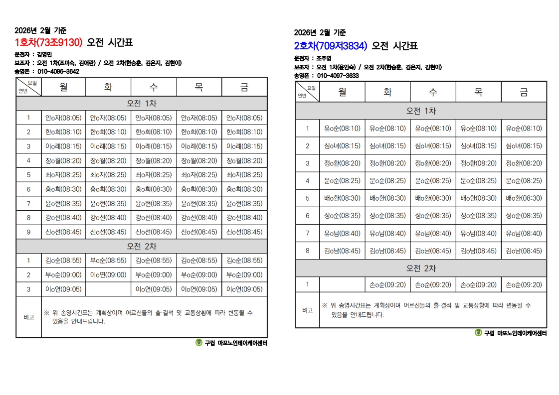 2026년 2월 이동서비스 시간표